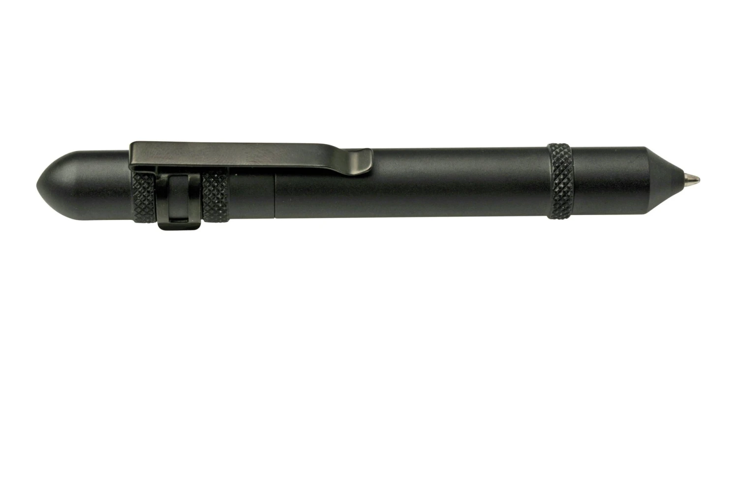 Der Böker Plus Bit Pen ist ein kleiner, handlicher taktischer Stift. Der Stift wurde von Kevin Passon und David Cyr entworfen. Diese beiden Männer sind in der Welt der Schreibgeräte seit Jahren für ihre praktischen Designs bekannt. Der Böker Bit Pen ist da keine Ausnahme. Der Stift ist aus schwarzem leichtgewichtigem Aluminium gefertigt. Um den Stift auf- und zuzudrücken, verwendet Böker einen Bolt-Action-Verschluss. So bleibt der Stift fest an seinem Platz und es macht auch Spaß, damit zu spielen. Mit dem Taschenclip kannst Du Dein Messer einfach überall hin mitnehmen. Im Kopf des Stiftes ist ein Bithalter versteckt. Er enthält einen Torx 6-8-Bit. Dies ist total praktisch für die kleinen Schraubarbeiten unterwegs. Der Stift ist kompatibel mit den Lamy M-22 Minen.